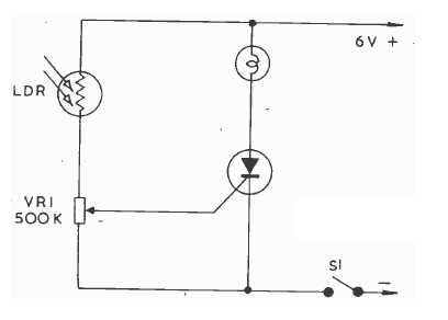 Este circuito tiene una acción opuesta al anterior, siendo activado cuando la luz incide sobre el sensor. Puedes disparar con una linterna. El SCR puede ser cualquier miembro de la familia 106.