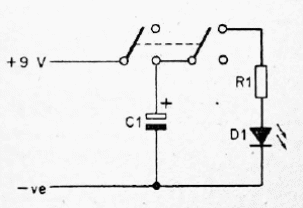 Cuando se activa este circuito el LED parpadea un momento indicando que la función ha sido activada. El capacitor puede tener valores entre 10 y 470 uF. R1 depende del LED.