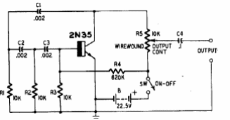 Este oscilador sinusoidal con transistor fue encontrado en una publicación de los años 60. El transistor es del tiempo y la frecuencia determinada por los capacitores de la red de cambio de fase.