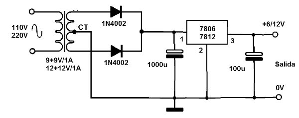 Esta es la configuración tradicional de una fuente de 6 o 12 V con circuitos integrados 7806 y 7812, para una corriente máxima de 1 A. Lo circuito integrado debe estar provisto de radiador de calor y la corriente máxima de salida es 1 A, y se da por la corriente máxima del secundario del transformador utilizado. El capacitor electrolítico debe ser al menos de 12 V para la fuente de 6 V y al menos de 25 V para la fuente de 12 V.