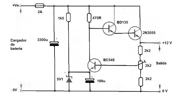 Los cargadores de baterías de 12 V proporcionan una mayor tensión no regulada. Presentado con el regulador, obtenido a partir de una revista inglesa de 1976 es posible obtener una fuente de 12 V a partir de un cargador de batería 12 V. El circuito puede estar equipado con componentes modernos y cambios que hemos hecho. Los restantes componentes son comunes y se debe dotar el 2N3055 de disipador de calor. La corriente máxima indicada es del orden de 2 A. El capacitor de 3 000 uF puede ser 3 300 uF o 4,700 uF.