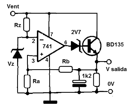 Este circuito consiste en un regulador de tensión para batería de 6 V con una caída de tensión muy baja. El transistor debe estar montado en disipador de calor y el BD135 es para una corriente máxima de 500 mA. El BC548 se puede utilizar para corrientes de hasta 50 mA. La tensión de entrada debe ser de al menos 3 V más alta que la tensión de salida deseada. La tensión de salida está dada por Vz (Rb / Ra + Rb) y Rz depende de la tensión de entrada y la tensión zener para el zener tenga una corriente da orden de 1 mA.