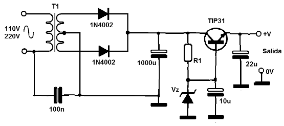 De hecho, la corriente máxima de salida de esta fuente depende del transformador que puede ser 6, 7,5, 9 o 12 V, dependiendo de la tensión deseada y la corriente hasta 1 A. El zener determina la tensión de salida, R1 es 470 ohms y rectificadores son diodos 1N4002 o 1N4004. El transistor debe estar provisto de radiador de calor. La filtración se puede mejorar aumentando el valor de C1.