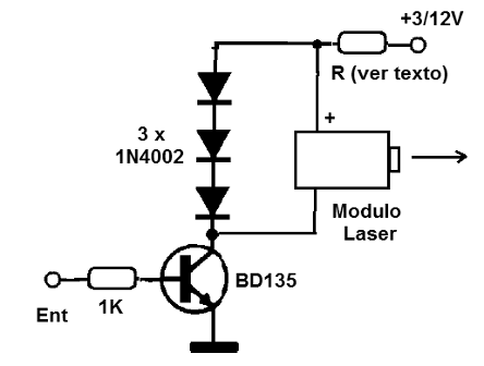 Este circuito permite controlar un puntero láser con una señal lógica de entrada. R tiene de 10 ohms para fuente de 3 V, 22 ohms a para 6 V y 47 ohms para 47 ohms para 12 V. Se obtuvo el circuito en mi libro Robótica mecatrónica y la inteligencia artificial, publicado en los Estados Unidos. El transistor debe tener un pequeño disipador de calor.