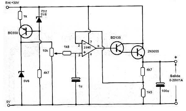 Encontramos este circuito en una publicación de de1980. Con los cambios de documentación básica, incluyendo transistores que fueron intercambiados por los tipos más modernos, el circuito se puede montar fácilmente hoy . El transistor Q3 debe estar provisto de un radiador de calor. La entrada debe hacerse con alimentación no regulada de 30 V.