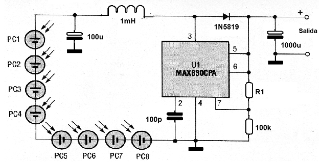 Este circuito se encuentra en una Popular Electronics de abril de 1993. Se trata de un circuito regulador de tensión para la batería solar. R1 y R2 determinan la tensión de salida basada en el número de células. Este circuito tiene una salida del regulador conmutado para 15 mA con una tensión de 7,2 V, pero llega a 51 mA a 3,3 V. R1 tiene valores entre 10k y 100k. Comprobar la disponibilidad del circuito integrado antes de salir para el montaje.