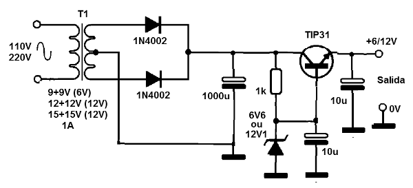 Esta fuente de alimentación fornece tensión que depende sólo del diodo Zener utilizado, puede suministrar corrientes de hasta alrededor de 3 A. El transformador tiene secundario 1 a 3 A como la corriente. Los diodos pueden ser el 1N4002 hasta 1 A y 1N5402 para corrientes más grandes. El transistor debe estar provisto de radiador de calor. El circuito es el libro Mechatronics Sourcebook de Newton C. Braga, publicado en los Estados Unidos.