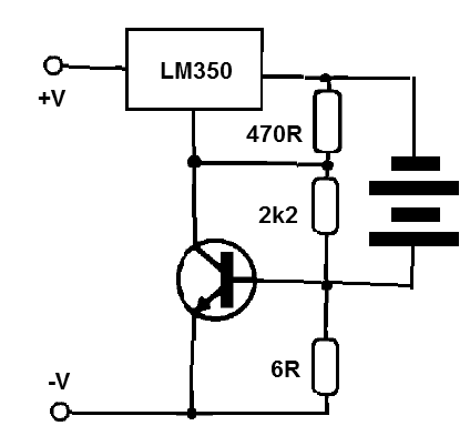 Este circuito es recomendado por Texas Instruments en la hoja de datos del TL317, equivalente al LM317, pero también se puede utilizar el LM350, que consta de un cargador con límite de corriente. El transistor puede ser el BD135. El circuito integrado debe ser montado en el radiador de calor. La corriente está dada por el resistor de 6,2 ohm y está alrededor de 100 mA en este caso.