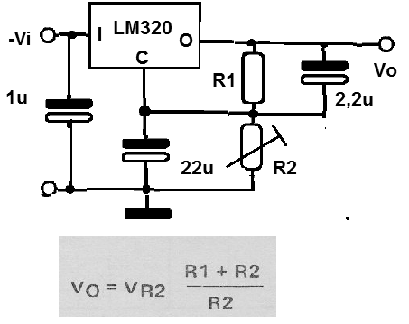 El regulador LM320 es para una tensión negativa hasta 15 V con una corriente máxima de 1 A. En este circuito tenemos su aplicación como regulador ajustable de 15 V. El circuito integrado debe estar provisto de radiador de calor. La fórmula para la obtención de la tensión de salida está cerca del diagrama. C1 y C2 son necesarios si la entrada y el regulador de carga son mucho o no son lo suficientemente filtrado. R1 tiene un valor típico de 220 ohmios.