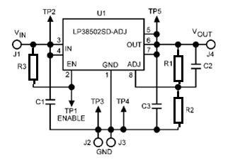 El circuito integrado LP380502SD-ADJ comprende un regulador de tensión de baja caída (LDO) con la salida hasta 1,5 A proporcionado en cubierta LPP-8. Las resistencias R1 y R2 determinan la tensión de salida basado en el circuito de la figura 1. La tensión de entrada puede ser de entre 3 y 5 V a 2,5 V para una salida obtenida: