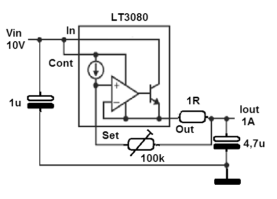 Uso el LT3080 de Linear Tecnologías en la figura tenemos una fuente de corriente constante con una tensión de 10 V. La corriente de entrada depende del resistor de 1 ohm ee la corriente de salida se ajusta en el potenciómetro 100 K ohms. Por supuesto, para los diversos tipos de recintos cubiertas deben proporcionarse disipadores de calor adecuados. Por supuesto, es más pequeño que los no LDOs equivalentes debido a que la caída de tensión y por lo tanto la disipación serán más pequeños.