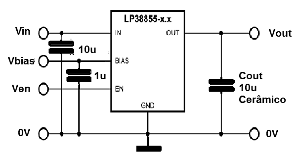 Diseñado para aplicaciones de batería accionado con voltajes de salida de 0,8 V a 1,2 V el regulador que se describe basan en el circuito integrado LP38855-x.x donde x.x determina el voltaje de salida requerido para la aplicación. Esta tensión puede ser 0,8 o 1,2 V. Los voltajes de polarización pueden estar entre 3,3 V y 5,5 V, que permite su uso con los microcontroladores. En la figura es la aplicación típica de este circuito regulador. El circuito es estable con capacitores cerámicos de 10 uF y el circuito integrado está disponible en cubiertas TO-220, TO-5 o A-263. La caída de tensión a través del circuito integrado regulador es solamente 1,5 mV con una A. El circuito con corriente de carga de 1,5 V es sugerido por National Semiconductor, que ahora es una empresa del grupo de Texas Instruments.