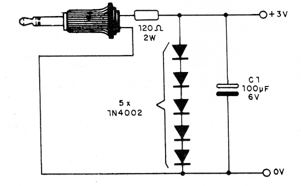 Este circuito convierte fuentes fijas de 9 o 12 V en 3 V para alimentación de circuitos utilizando dos pilas pequeñas. El enchufe para fuente de alimentación puede ser reemplazado por un adaptador de coche de 12 V. Para la entrada de 6 V puede ser un resistor 47 ohmios x 2 W. La corriente máxima del reductor es del orden de 50 mA. Los diodos también pueden ser el 1N4004 y el capacitor puede tener valores entre 100 a 1 000 µF.