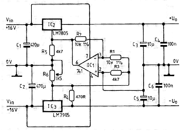 Con este circuito, de una publicación de 1991, se puede ajustar la salida de una fuente simétrica con un potenciómetro simple. El circuito puede ser adaptado a otros reguladores y en este caso la corriente de salida máxima es de 1 A. Los reguladores deben estar provistos de un radiador.