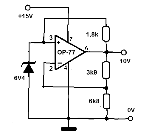 En la figura tenemos una referencia de tensión de alta estabilidad, proporcionando una tensión de 10 V e de salida sustancialmente independiente de las variaciones de tensión de entrada. La corriente en el diodo Zener es solamente de 2 mA valor dado por R1. Así para que la estabilidad se mantenga en esta fuente, la resistencia debe ser de tipo 5 ppm / ° C y el diodo deben tener una proporción de 1 ppm / oC.