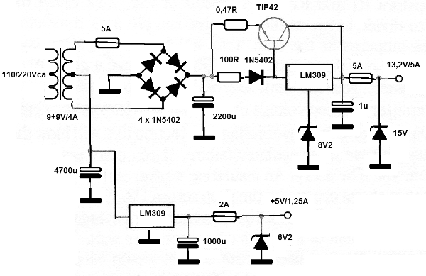 Se encontró esta fuente en una publicación de Estados Unidos de 1982, pero se puede montar fácilmente usando el 2N2995 (versión PNP del 2N3055) en lugar del tipo original, así como otros cambios que hemos hecho. Este transistor se debe montar en excelente radiador de calor. También hicimos algunas correcciones de errores que encontramos en el circuito original.