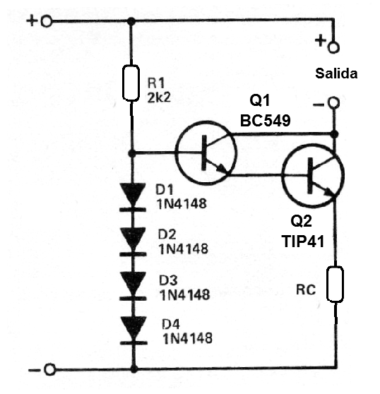 Esta fuente de corriente constante, de una publicación 1980, se puede utilizar en un cargador de batería. El transistor Q1 puede ser el BC548 y la tensión de entrada debe ser mayor que corriente de la carga en la batería. Rc se encuentra dividiendo 1500 mA lea corriente que se desea a la salida. Por ejemplo, para 300 mA, tenemos 1500/300 = 5 ohmios. El transistor Q2 debe estar provisto de radiador de calor. La corriente máxima recomendada de 2.