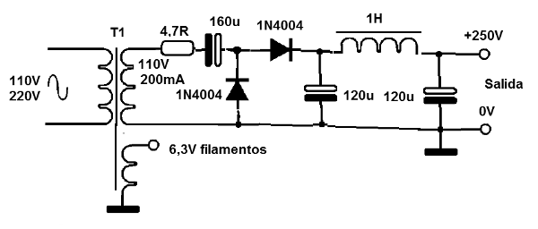 Esta unidad se obtuvo en una publicación anterior para un aparato de válvula, sino que también sirve para alimentar equipo ordinario que requieren alta tensión continua. El transformador puede ser del tipo de aislamiento no es con válvula y el diodo puede ser el 1N4007. Capacitores de filtro deben tener tensión de aislamiento de 200 V o más. En algunas aplicaciones, el choque de filtro puede ser sustituido por una resistencia de alambre de 1 k x 10 W.