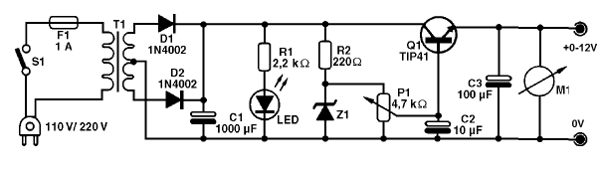 Esta fuente puede proporcionar tensiones de alimentación de 0 a 12 V en las corrientes de hasta 2, establecidas en el potenciómetro P1. El transistor debe estar provisto de un buen radiador de calor y el diodo Zener es de 12V6 con 1W disipación. El devanado secundario del transformador puede ser de 12 + 12 V o 15 +15 V con una corriente de 2 A. El indicador de tensión de salida es opcional, ya que en su lugar se puede utilizar el multímetro. El circuito no tiene protección contra cortocircuitos en la salida. Puede mejorar su desempeño con el aumento del capacitor de filtrado C1 a 2 200 uF o incluso 4,700 uF. La tensión de trabajo de este componente debe ser de al menos 25 V.