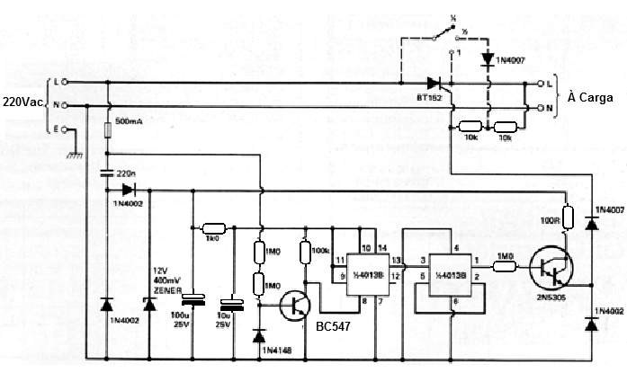 Este interesante convertidor AC / AC sólo es adecuada para cargas resistivas habiéndose obtenido en una publicación de 1982 El circuito soporta cargas de hasta 1,5 kW, pero el transistor debe ser montado en un disipador de calor excelente, así como el SCR responsable de la corriente de carga máxima. SCRs de la serie TIC se pueden utilizar, pero de acuerdo con su corriente será la potencia de carga máxima. El capacitor de 220 nF debe tener aislamiento 450 V o más y siendo el tipo de poliéster. El circuito es adecuado sólo para cargas resistivas, ya que la forma de la tensión de salida no es sinusoidal.