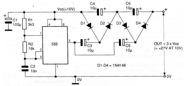 Esta configuración tradicional triplicador con el 555 se puede encontrar en otros artículos en este sitio. Esta es de una documentación de 1998. La tensión de salida es casi el triple de la tensión de entrada de hasta 15 V. La corriente es demasiado baja, del orden de unas pocas decenas o cientos de microampères. El circuito utilizado para aplicaciones de muy baja potencia.