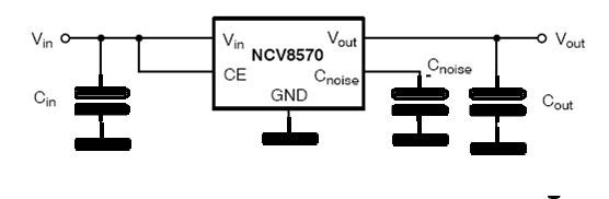 El circuito mostrado en la figura consta de un regulador de baja caída de tensión (LDO) para 200 mA. El circuito usa el NCV8570 de ON Semiconductor (www.onsemi.com). El circuito integrado utilizado puede ser elegido para tener tensiones de salida de 1,8 V, 2,5 V, 2,75 V, 2,8 V, 3,0 V y 3,3 V. El ruido es sólo 15 uVrms y tiene apagado térmico. Comprobar la disponibilidad del componente antes de realizar su uso en un proyecto.