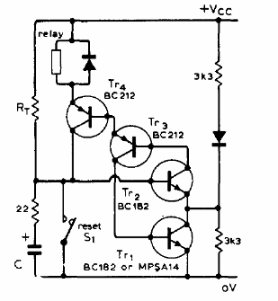 Los transistores de este circuito de temporización pueden ser tipos más modernos como los BC548 y BC558. El circuito es de una documentación técnica de 1979. El tiempo obtenido depende de la constante RC de entrada. El relé puede ser de 6 V o 12 V según la alimentación usada.