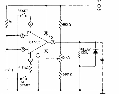 Esta configuración es del RCA Linear Integrated Circuits y MOSFETs de la RCA de 1977. En ella tenemos el modo de conectar el 555 (con simbología de la RCA) en el modo reset. El relé es de baja corriente y se puede conectar directamente a la salida del 555.