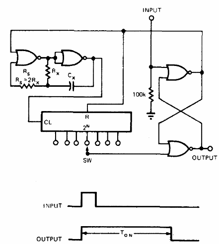 Este circuito utiliza un contador 4020 que divide la frecuencia hasta 210, siendo encontrado en una antigua publicación americana. Rx y Cx determinan los pasos de la temporización y, por lo tanto, el tiempo máximo. La alimentación se puede hacer con tensiones de 5 a 15 V. Encontramos el circuito en una documentación de los años 70, pero es bastante actual.