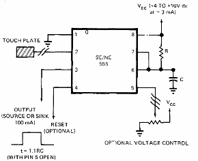 Encontramos en una antigua documentación este modo de usar un 555 como llave de toque monoestable. El circuito no debe ser alimentado por fuente sin transformador. El 7555 (CMOS) es más sensible en este tipo de aplicación.