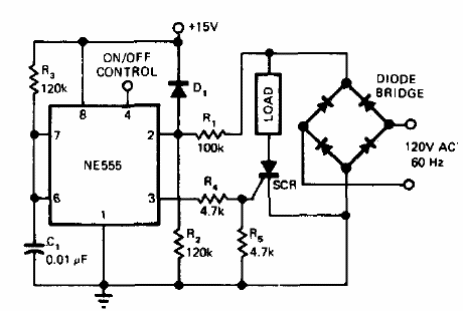 En la figura tenemos el modo de utilizar el 555 como disparador de SCRs en el paso por cero. El circuito es de una documentación de 1977. El 555 funciona como el monoestable redisparando a cada medio ciclo de la tensión de alimentación. Diodos y SCR deben tener especificaciones de acuerdo con la carga controlada.
