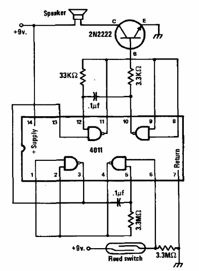 Este circuito emite bips cuando el sensor es accionado por la apertura de la puerta del congelador o en otras condiciones que pueden ser determinadas por el usuario. El circuito es de una Modern Electronics de 1976. La alimentación se puede hacer con tensiones de 6 a 12 V.