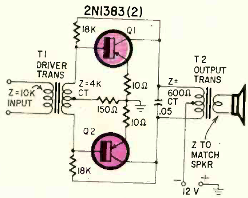 Esta etapa de potencia con dos transistores se encontró en la revista Radio Electronics de octubre de 1963. Los transistores deben estar equipados con disipadores y la tensión de alimentación es de 12 V.