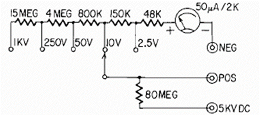 En la figura tenemos el circuito de un voltímetro simple con un instrumento de 50 uA y una bobina de 2k. El circuito incluye una escala de alta tensión. La selección de bandas se realiza mediante clave.