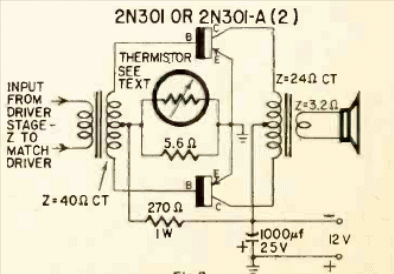 Esta etapa de potencia de 12 W con dos transistores de contrafase se encontró en una Radio Eklectronics de septiembre de 1958. El circuito tiene una salida de altavoz de 32 ohms, según el transformador.