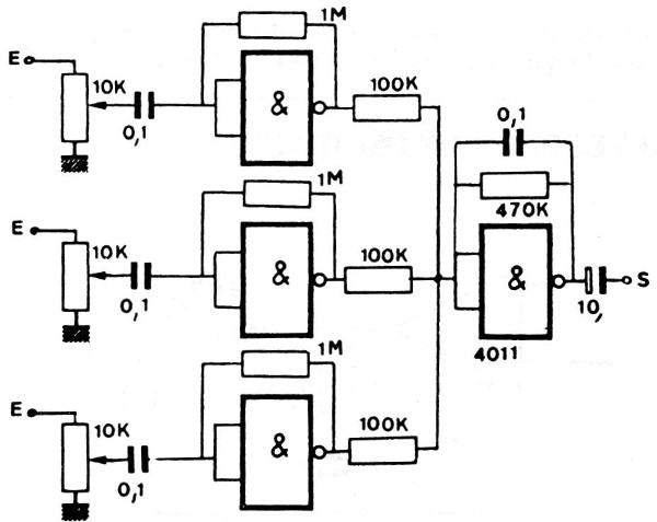 Esta configuración de los años 80 utiliza puertos NAND CMOS tipo A, que presentan respuesta lineal con resistores de realimentación. El circuito es de una documentación de los años 80. La alimentación puede ser hecha con tensiones de 3 a 15 V y los cables de señal deben ser blindados.