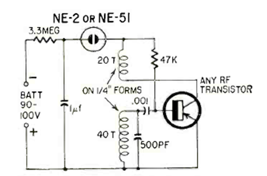 Este circuito diferente fue encontrado en una Radio Electrónica de agosto de 1965. Funciona con una tensión de 90 V que proviene de una batería especial de la época, pero puede utilizar una fuente de la misma tensión. El consumo es extremadamente bajo.