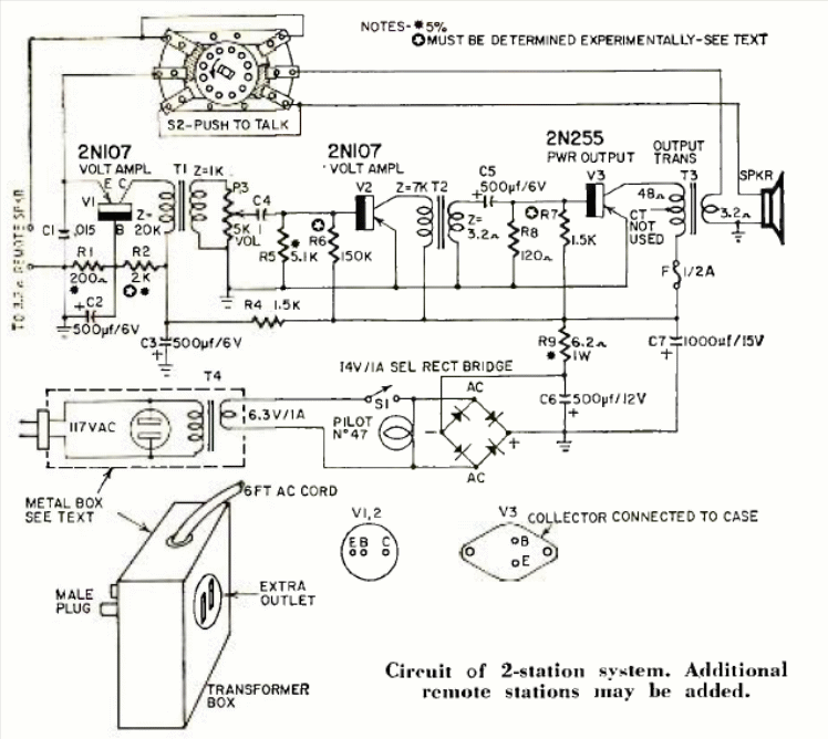 Este circuito fue encontrado en la revista Radio Electronics de junio de 1958. La distancia máxima depende de las pérdidas en los cables. Se pueden agregar más estaciones.