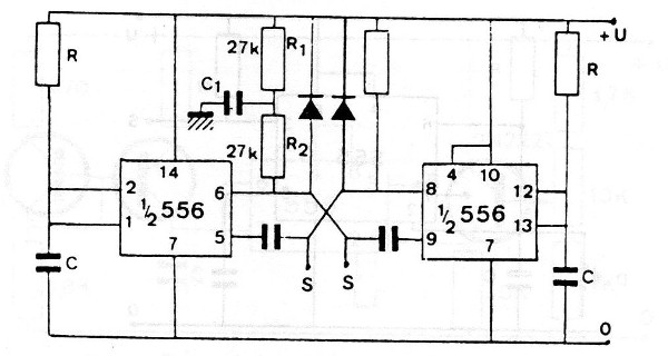 Esta configuración aparece en otros artículos de esta sección, pero es muy interesante. Se trata de un monoestable con dos disparos utilizando dos circuitos integrados 555. La alimentación se puede hacer con tensiones de 3 a 15 V y la constante de tiempo es dada por R y C. Los diodos son de uso general de silicio.