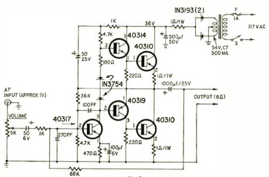 Este amplificador de transistores se publicó en la revista Radio Electronics en julio de 1965. Utilizaba transistores de silicio recién lanzados con excelente calidad de sonido.