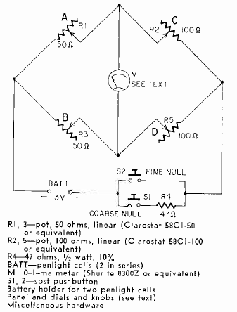Este circuito puente para banco puede tener varios usos. Lo encontramos en la revista Radio Electronics de junio de 1960. El circuito puede utilizar diferentes tipos de galvanómetros.