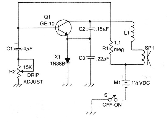 Encontramos este circuito en un libro americano de 1981. Él produce el ruido de un grifo que gotea o aún de una gotera. La bobina L1 es un choque de 100 mH y el transistor puede ser un BC548. El altavoz es de tipo miniatura y la alimentación se puede realizar con 1,5 V o 3V. El trimpot de ajuste puede ser de 22k o 47k. El diodo puede ser el 1N34.