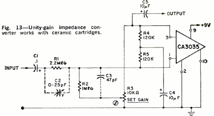 Encontrado en un artículo de la revista Radio Electronics de febrero de 1970 que describe aplicaciones para el CA3035, este circuito tiene ganancia unitaria y alta impedancia de entrada. Se recomienda su uso con cartuchos fonográficos cerámicos.