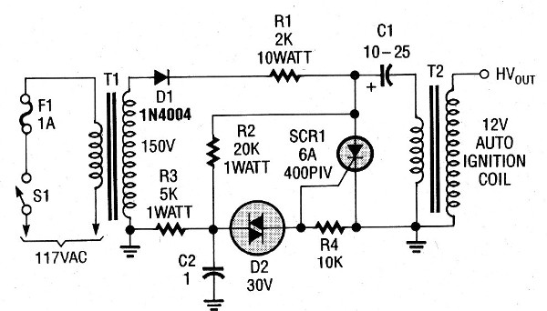 Este circuito produce alta tensión que puede llegar a más de 20 000 V usando una bobina de encendido de automóvil y un Triac. La frecuencia de los pulsos se determina por R2 / C2. El transformador es opcional en algunos casos, pero trae seguridad en el aislamiento de la red de energía.