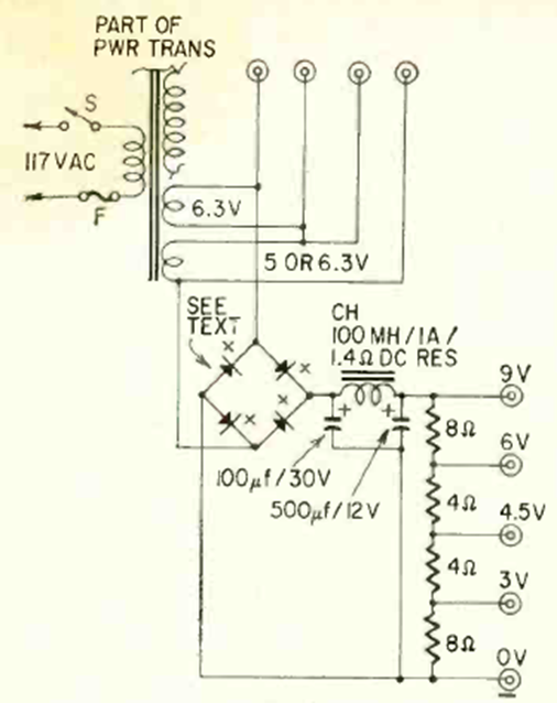 Este sencillo circuito no regulado fue encontrado en una Radio Electrónica de junio de 1964. Tenga en cuenta que la tensión indicada en las salidas es sin carga. La corriente máxima depende del transformador.