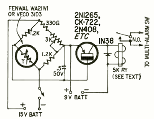 Mediante un termistor, este puente encontrado en Radio Electronics de mayo de 1966 detecta variaciones de temperatura. Se puede utilizar en una alarma de incendio activando un relé.