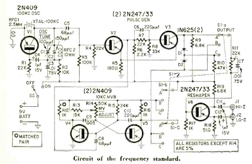 Este circuito de banco lo encontramos en una revista de Radio Electronics de julio de 1962. Los transistores son de la época, lo que limita la frecuencia generada a unas pocas decenas de megahertz.