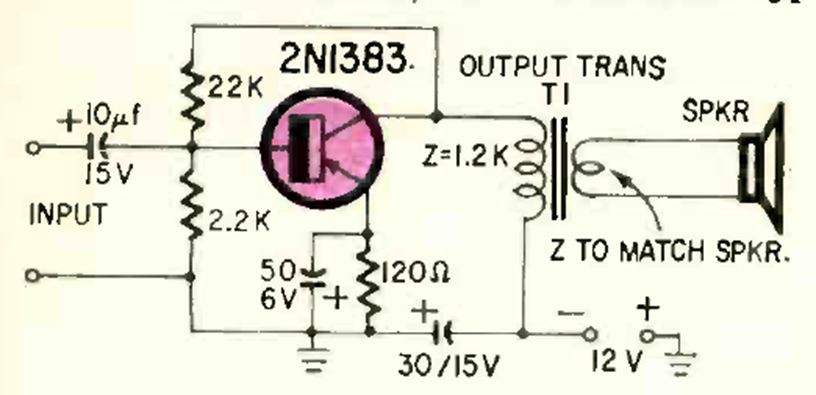 Este circuito es de Radio Electroncs de octubre de 1963. Utiliza un solo transistor 2N18383 y un transformador. El circuito tiene una distorsión del orden del 4 al 6% y se alimenta con 12 V. El transistor es un tipo de potencia en la época.