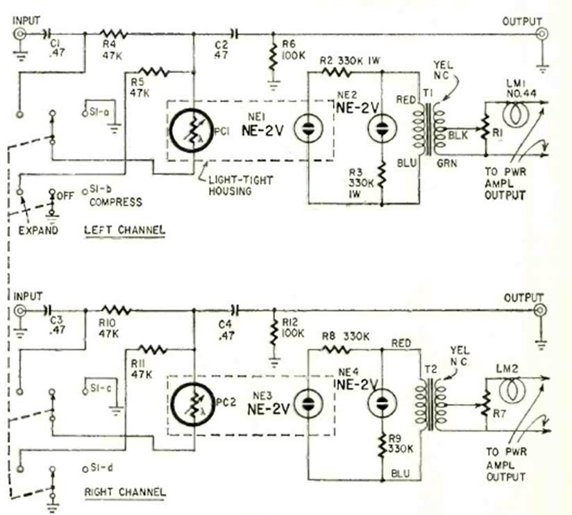 Este circuito consta de un compresor de audio estéreo. Lo encontramos en la revista Radio Electronics de octubre de 1968. El circuito utiliza un acoplador óptico fabricado con una lámpara de neón y LDR.