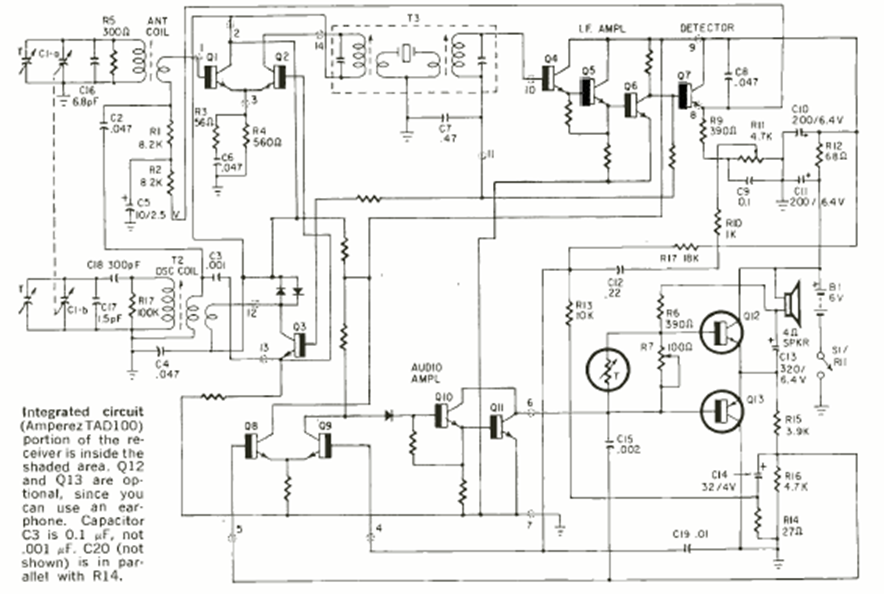 Esta es una de las primeras radios con circuito integrado. El circuito es de una Radio Electronics de noviembre de 1969. El circuito está alimentado por una batería de 9 V.